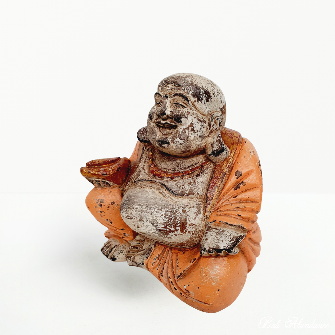 Artisan-crafted seated Buddha figure from Bali, meticulously carved by hand to capture the joyful essence of this beloved spiritual symbol. Each piece reflects traditional Balinese craftsmanship, bringing warmth and positive energy to your space. A timeless addition to any home or meditation sanctuary.