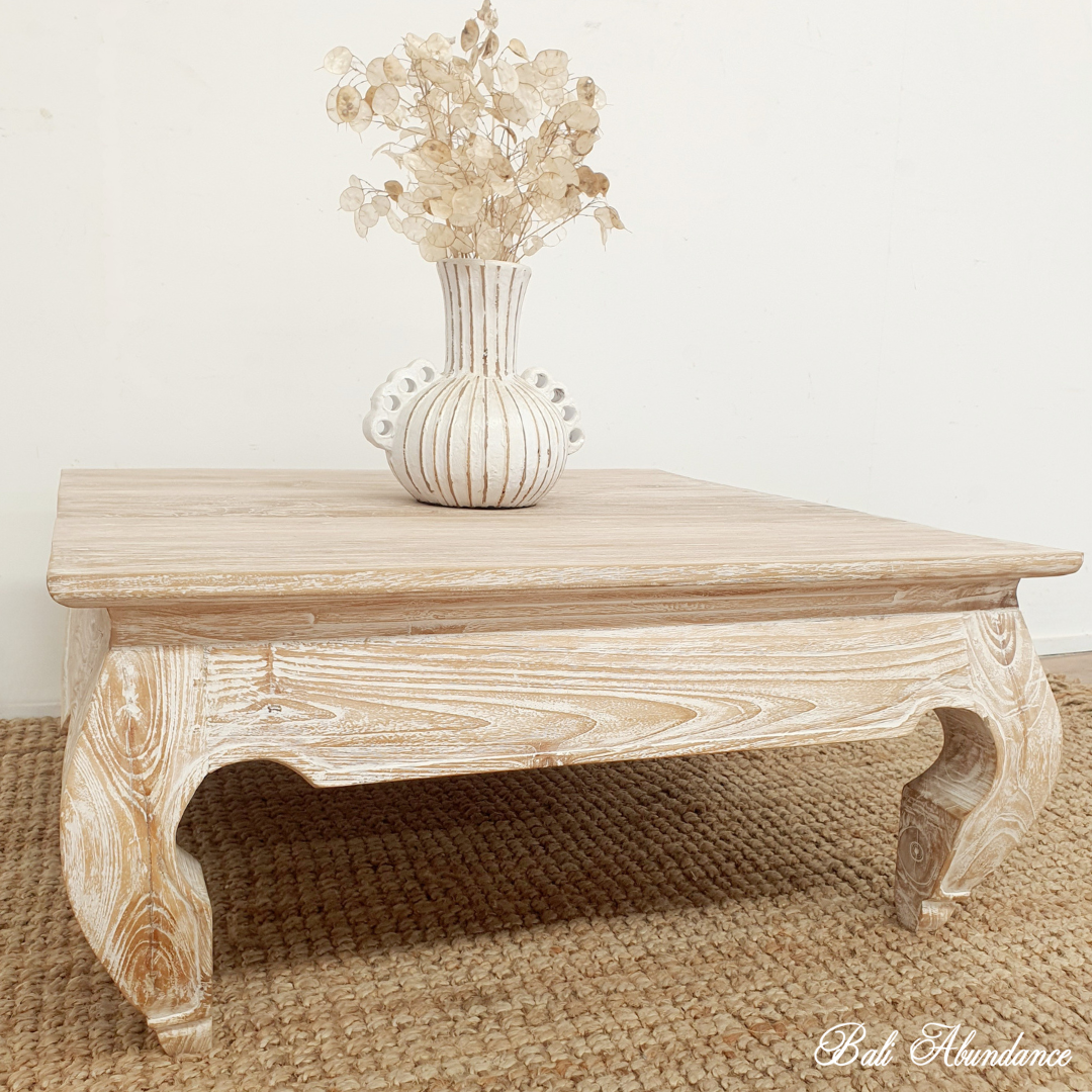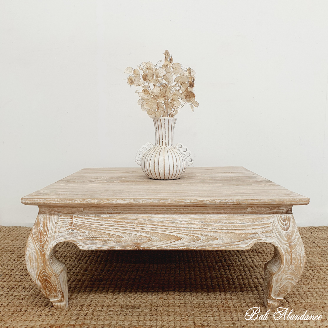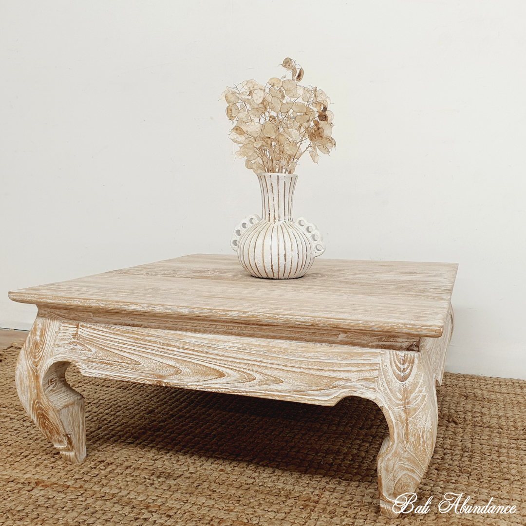 Elevate your living space with our Opium coffee table, a stunning piece that brings authentic Bali charm directly into your home. Meticulously hand carved from teak wood, this table showcases the natural beauty and durability that makes teak a treasured choice for quality furniture. The elegant whitewash finish creates a soft, coastal aesthetic that complements both contemporary and traditional interiors, while the distinctive curved opium legs add an unmistakable touch of Balinese craftsmanship and character. Perfect as a striking focal point in your living room, this coffee table combines functionality with artistic appeal. The spacious surface provides practical space for entertaining, displaying décor, or simply enjoying your morning coffee, while the intricate hand-carved details tell a story of traditional artisanal skill. Whether you're creating a relaxed tropical retreat or adding an exotic accent to your existing décor, this piece invites guests to pause and admire its timeless beauty and cultural heritage.