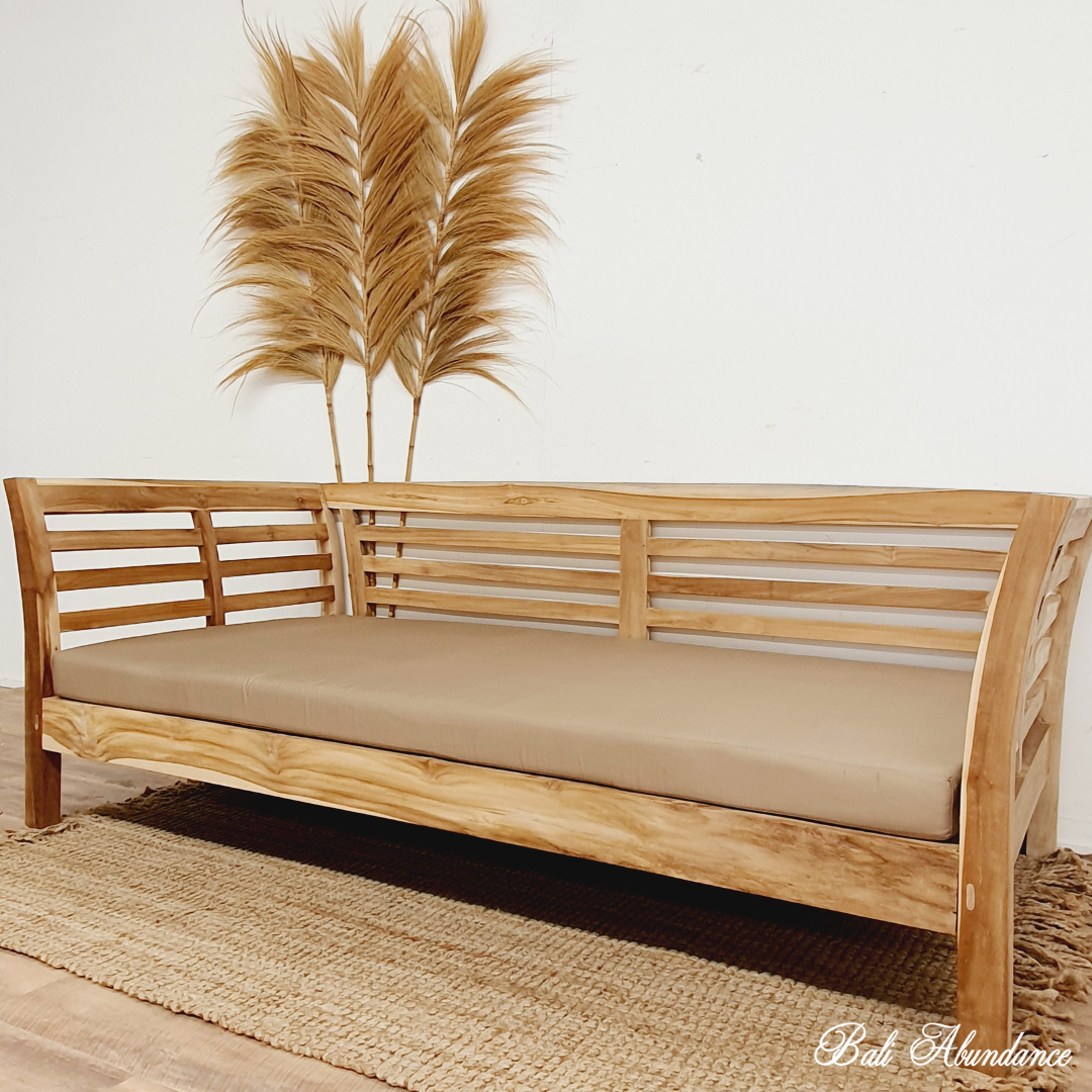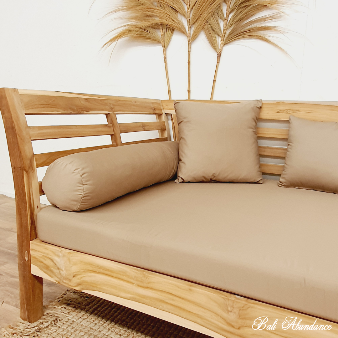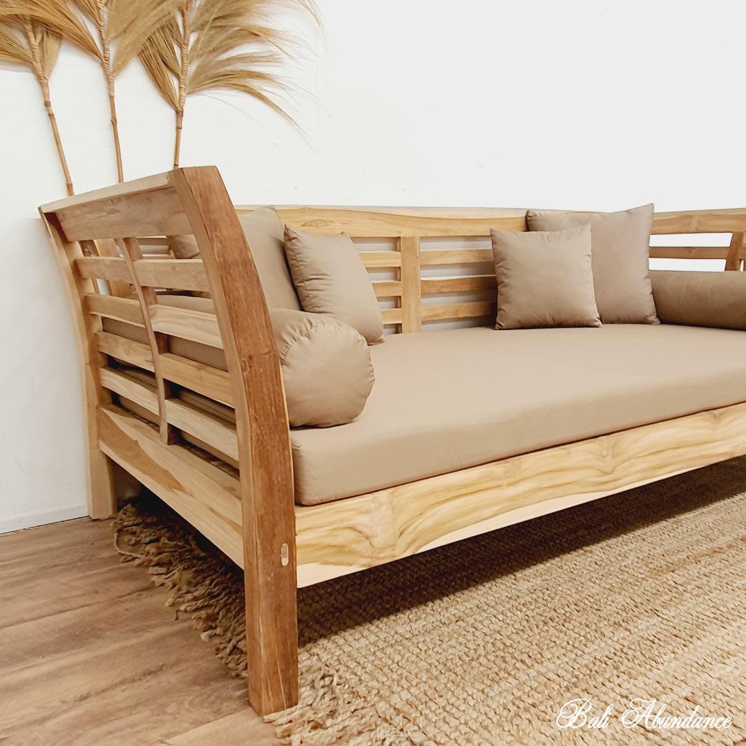 Luxuriate in modern minimalism with our exquisitely crafted Minimalistic Daybed with 7 Piece Cushion Set in raw. The sumptuous lines of the sleek teak frame are complemented by the plush 7 piece cushion set, inviting you to find serenity in style. Perfect for a luxurious lounge area, relaxing with friends, or just taking a moment to yourself. Handcrafted from sustainable teak wood, this daybed embodies the essence of Balinese design—where natural beauty meets functional elegance. The raw finish celebrates the wood's authentic grain and character, creating a warm, organic aesthetic that transforms any space into a sanctuary. The generous cushion collection provides layered comfort, allowing you to customize your lounging experience with ease. Whether you're creating a tranquil reading nook, an inviting guest retreat, or a peaceful meditation space, this daybed serves as both a statement piece and a practical sanctuary. Ideal for those who appreciate understated luxury and the timeless appeal of natural materials.