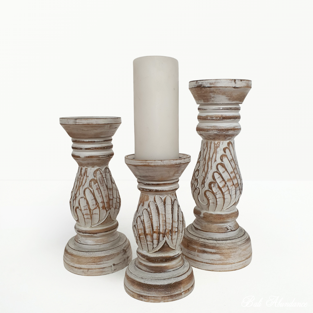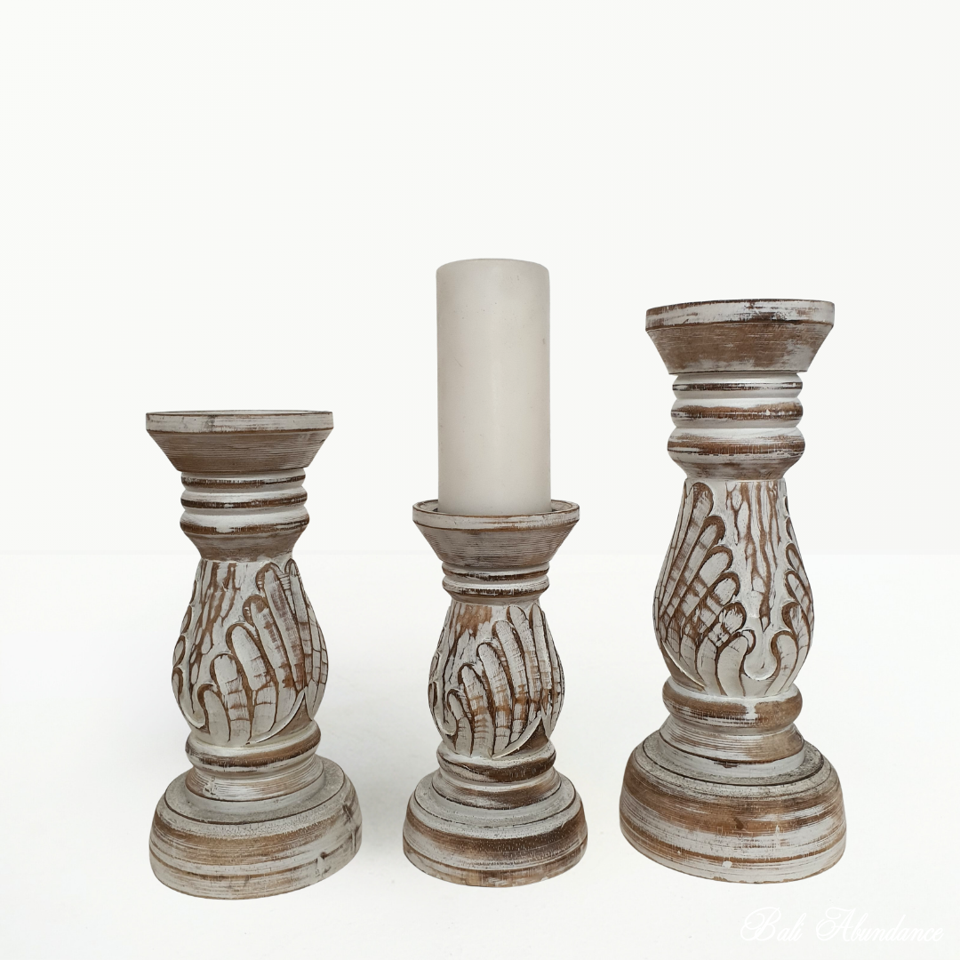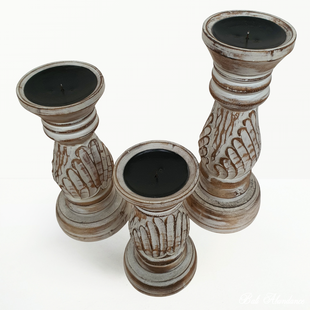 Bring warmth and character to your home with this trio of handcrafted wooden candlesticks, featuring a charming whitewash finish with natural brown undertones. Perfect for creating an inviting ambiance on your console or dining table, these pieces capture the relaxed elegance of Balinese design. Group them together for maximum impact or scatter throughout your space for subtle coastal-inspired charm.