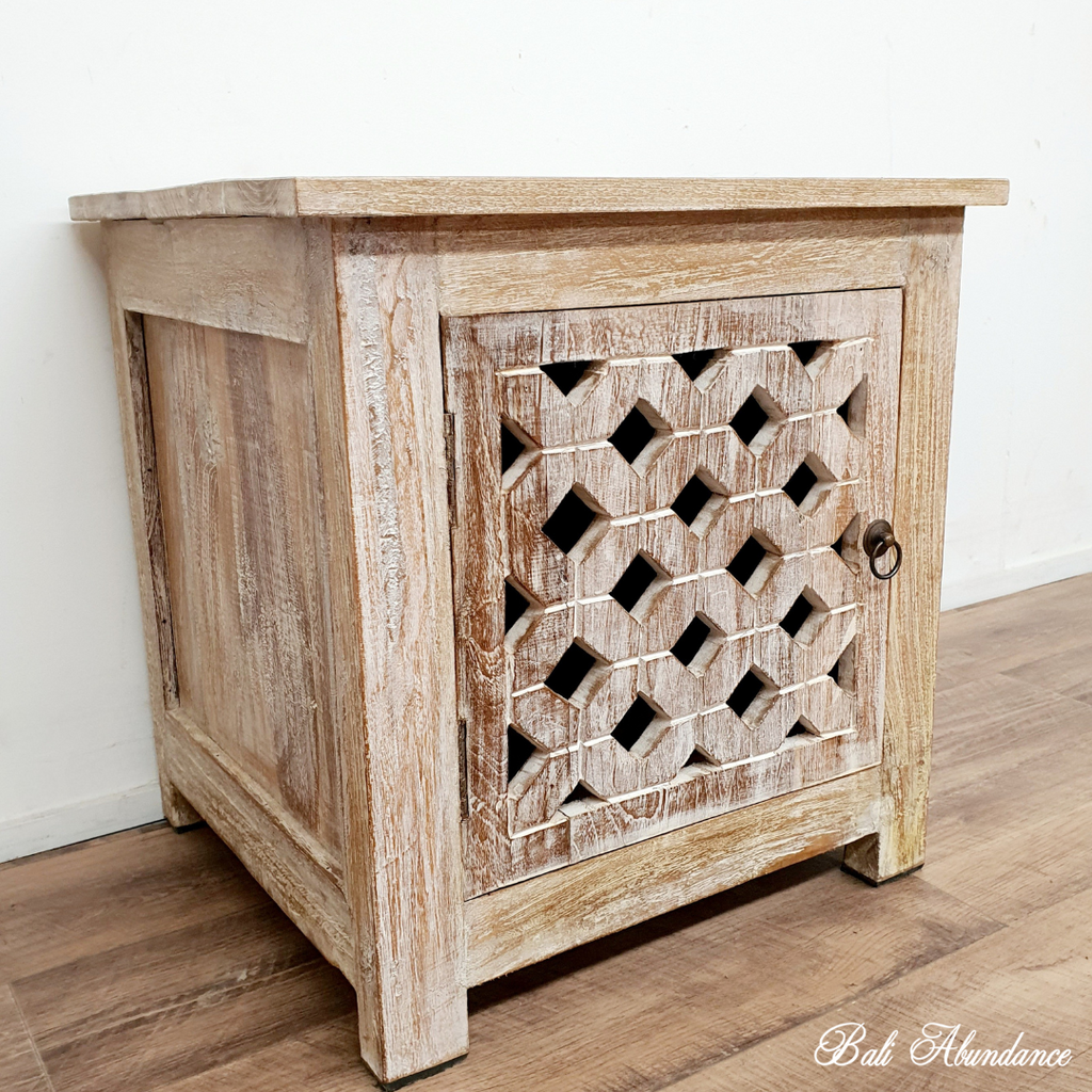 UBUD Hand Carved Teak Bedside Table Jati Wash - Design 2