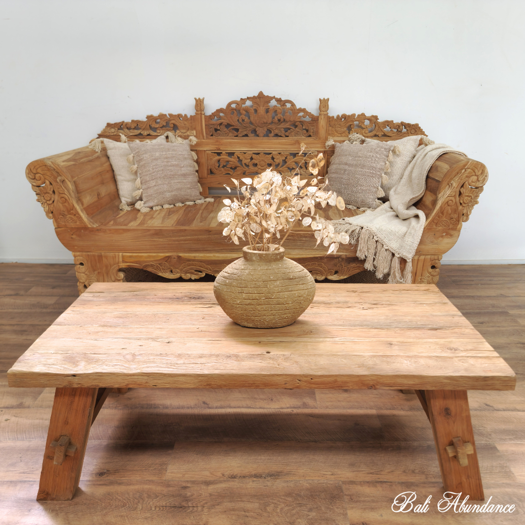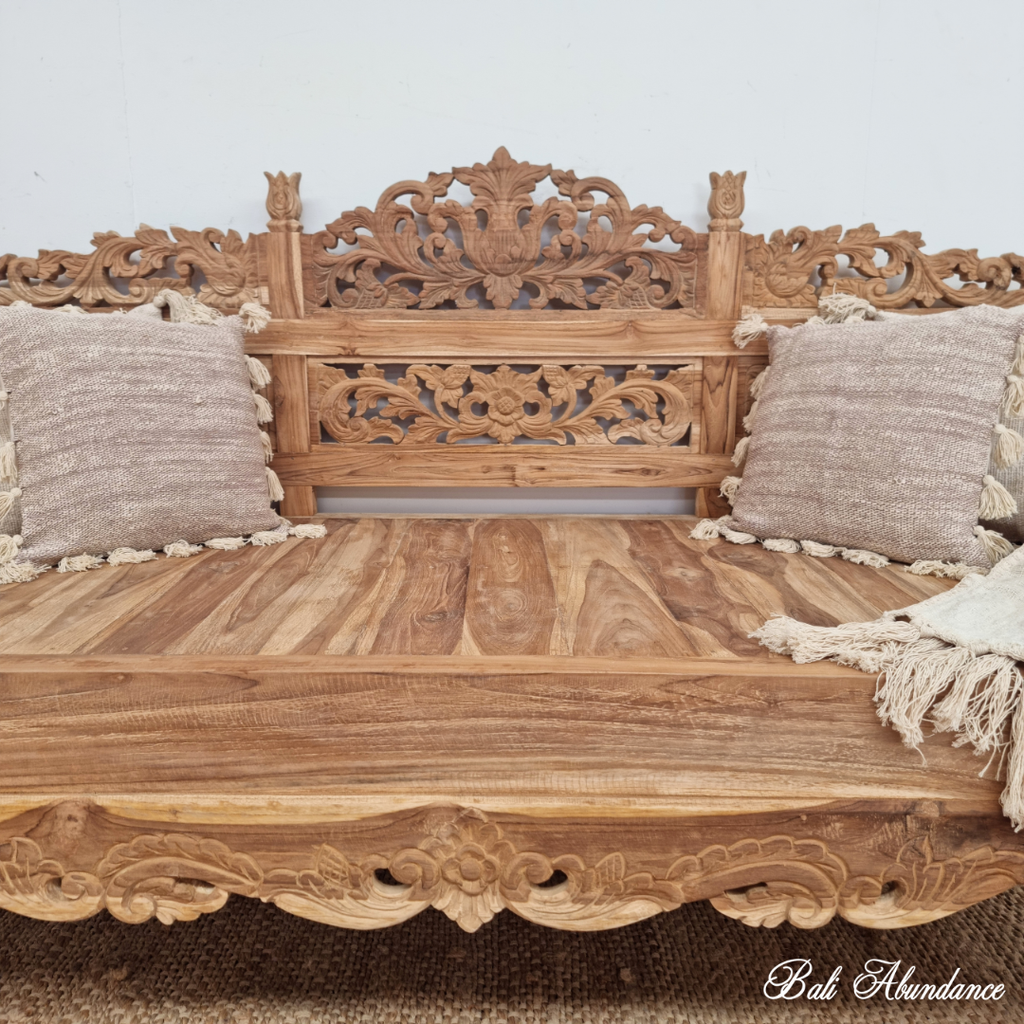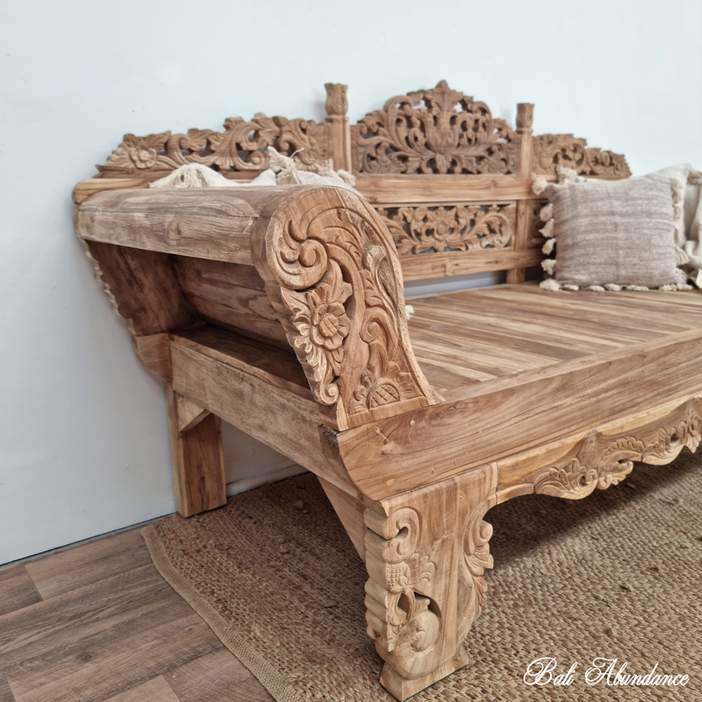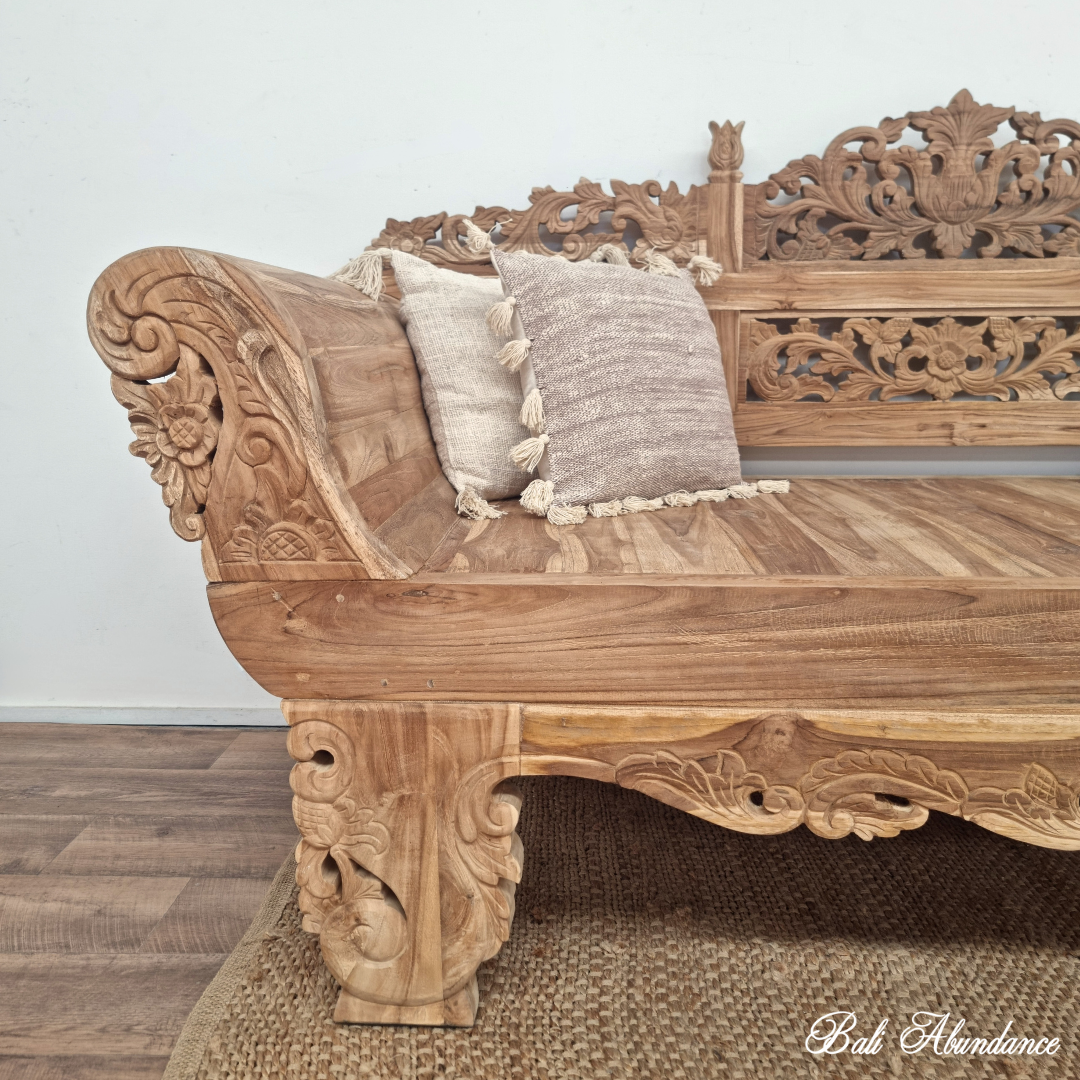 Embrace the spirit of Bali with this exquisite hand-carved daybed, a masterpiece born from generations of traditional craftsmanship. Each curve and detail reflects the artistry of skilled Balinese woodcarvers who pour their soul into every piece. The rolled arms invite you to sink into comfort while the raw wood finish celebrates the natural beauty of sustainably sourced timber, revealing warm honey tones and organic grain patterns that tell stories of the island's forests. This daybed transcends mere furniture—it's a portal to tranquility. Position it in your bedroom as a meditation sanctuary, place it on a veranda to catch ocean breezes, or nestle it in a reading nook where you can escape the world. The rolled arms cradle you in support, perfect for afternoon siestas, morning coffee rituals, or evening contemplation. The raw finish ages gracefully, developing character and patina that deepens its connection to nature and time. Infuse your home with Balinese serenity and authentic island living. This daybed transforms any space into a peaceful retreat that whispers of tropical gardens, gentle rhythms, and the unhurried pace of paradise. A timeless investment in comfort, culture, and conscious living.