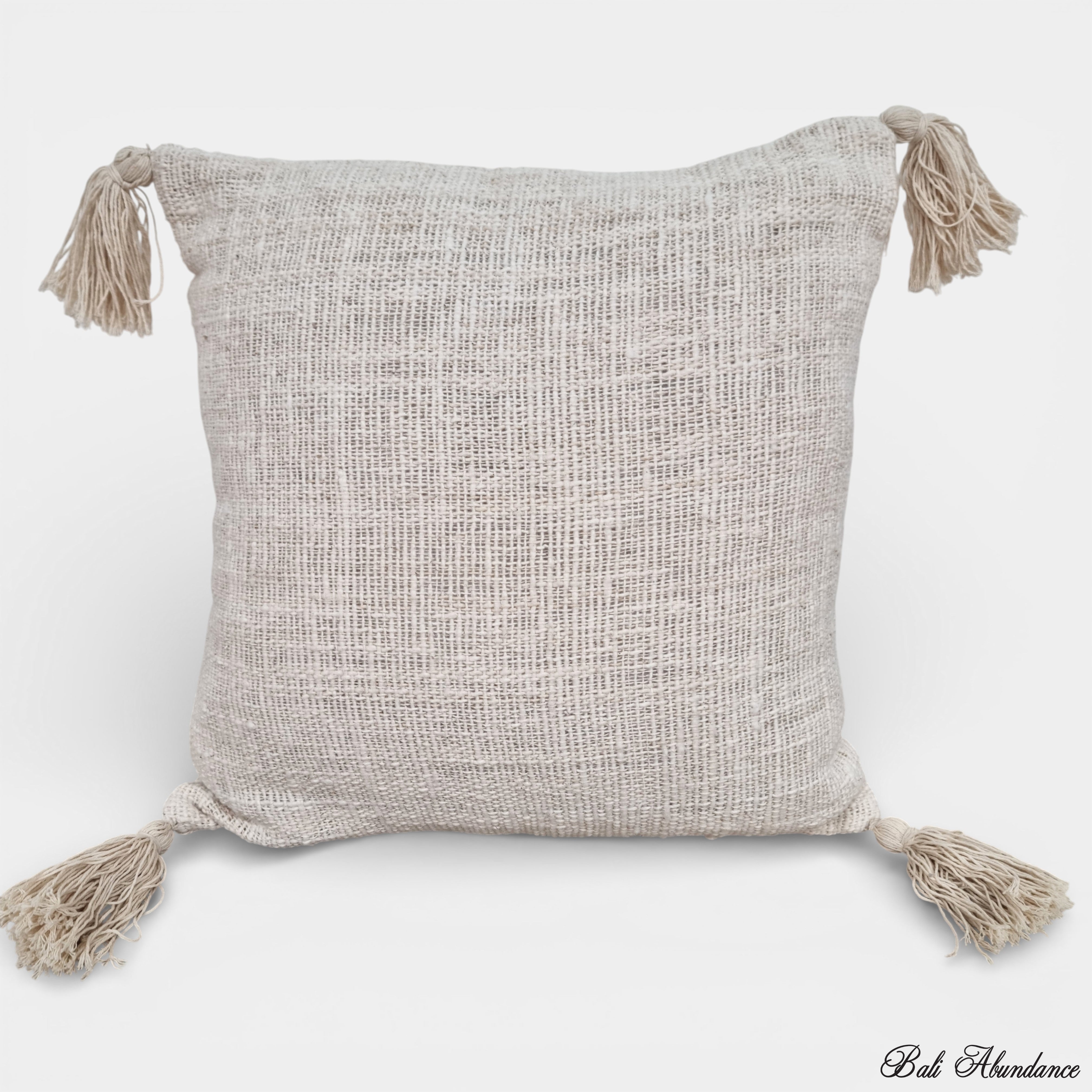 A lovely open weave cotton fabric cushion cover with tassels, perfect for adding warmth and texture to any living space. Crafted from breathable cotton, this cream-coloured cover features delicate tassels at each corner that bring an artisanal, bohemian charm inspired by Balinese design traditions. The open weave construction creates an airy, relaxed aesthetic while maintaining durability for everyday use. Measuring 50 x 50 centimetres, it's an ideal size for standard cushions. Whether layered on a sofa, bed, or outdoor seating, this versatile piece effortlessly complements both contemporary and eclectic interiors, bringing a touch of island-inspired elegance to your home.