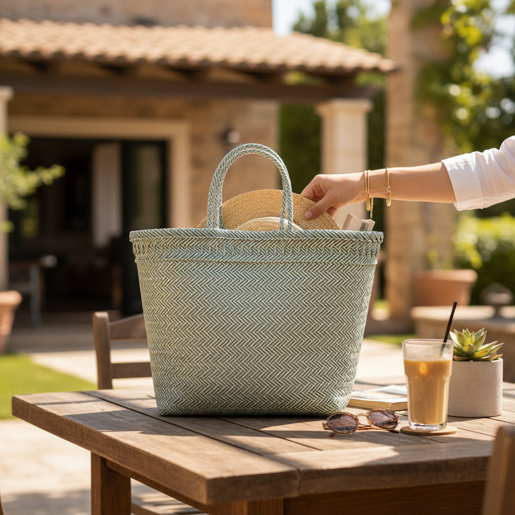 Our recycled plastic market basket bag will make you the envy of every shopper as you stroll down the street. The colourful weave is sustainable and lightweight, providing both functionality for all your needs. This bag is strong and durable for shopping trips.