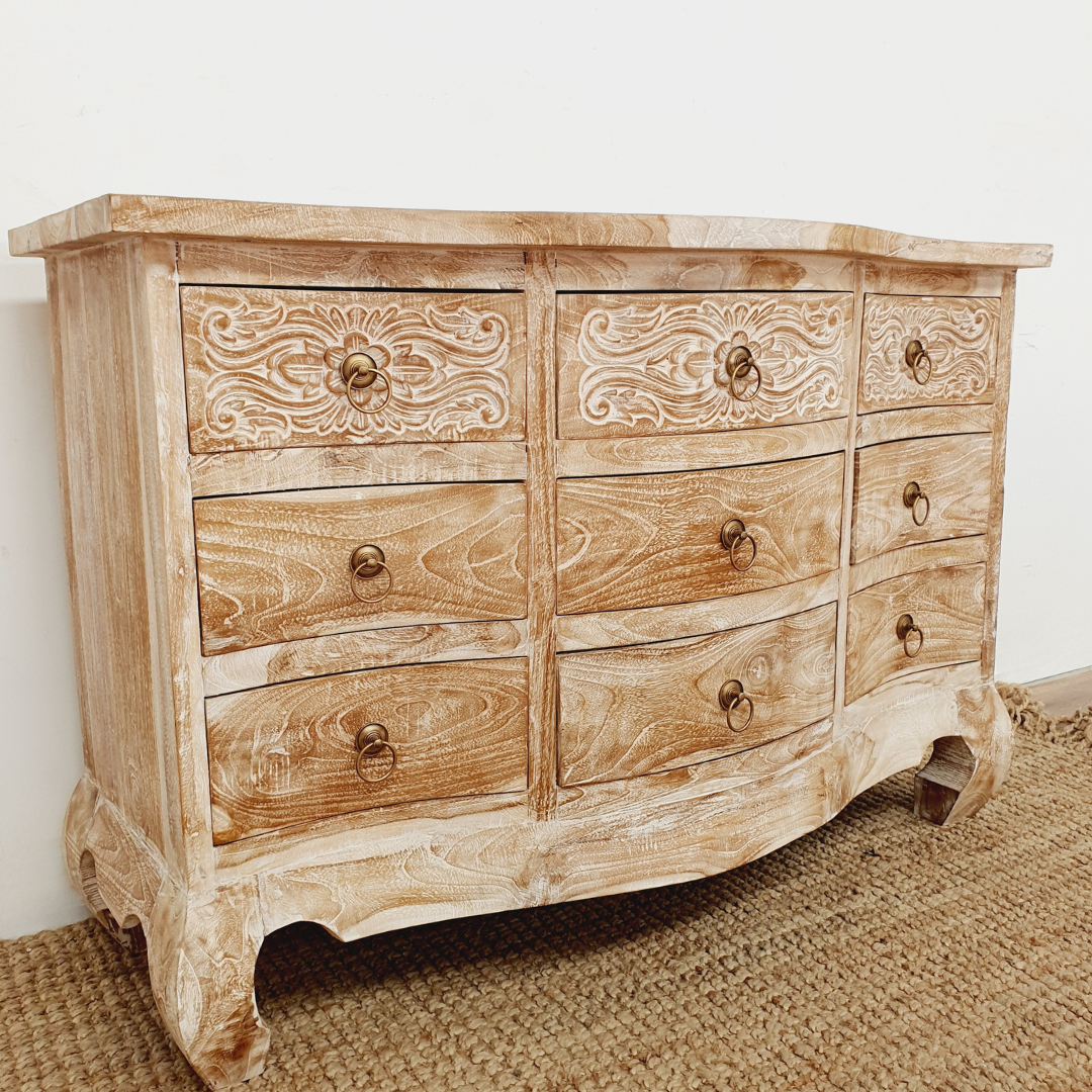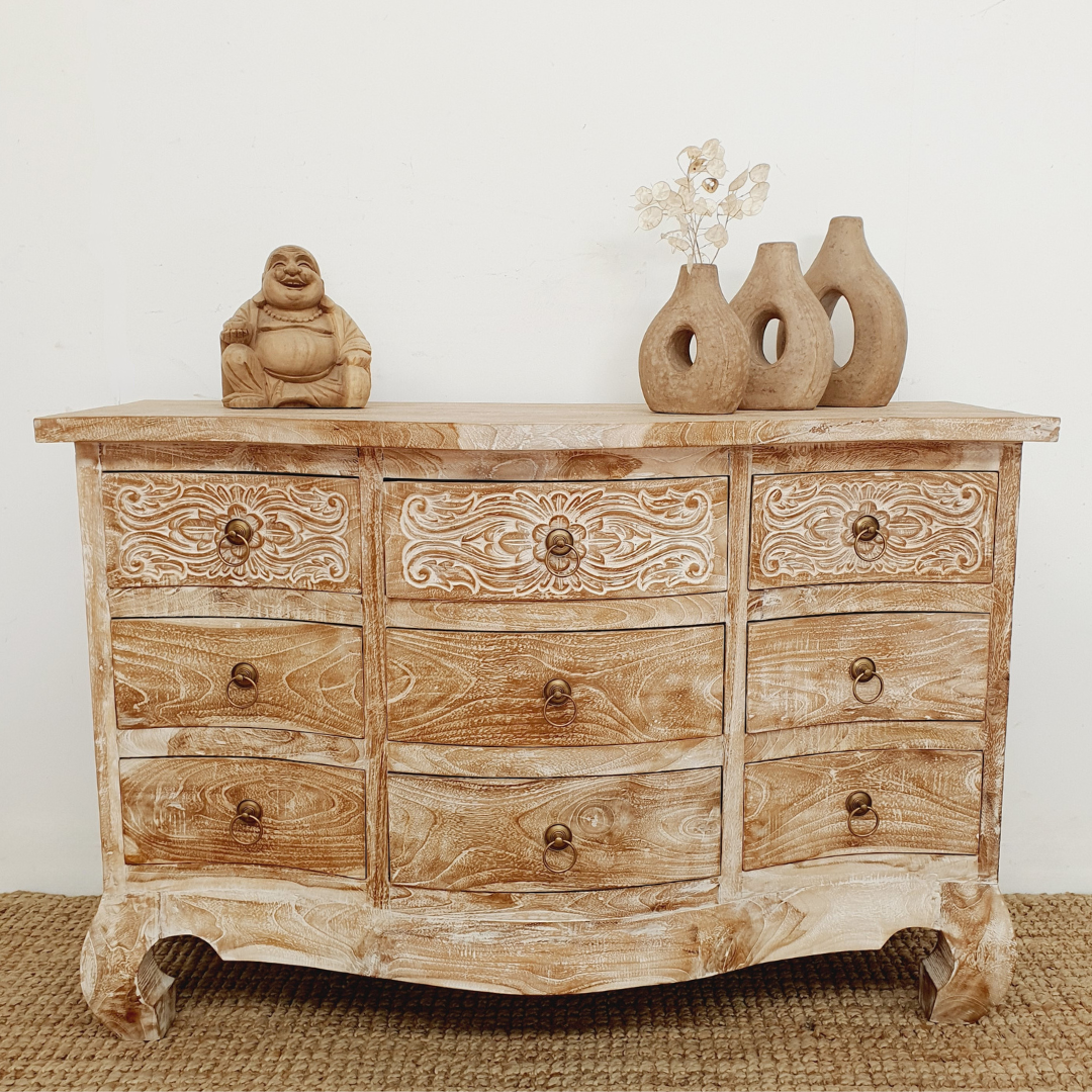 The Opium 9 Drawer Hand Carved Teak Wood Tallboy exudes elegance and provides an ideal complement to any bedroom. Its curved edges create an eye-catching look that will definitely elevate your space.