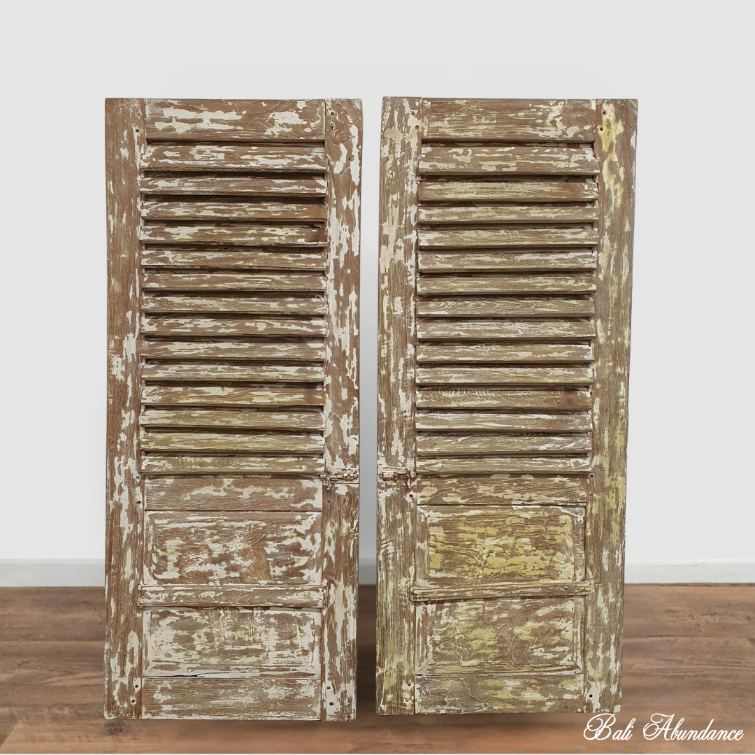 Elevate your interior with this pair of vintage Balinese louvre window shutters, authentic relics that bridge functional design and artistic expression. Finished in a timeless cream palette, these shutters showcase the meticulous craftsmanship of traditional Balinese artisans, featuring precisely carved louvre slats that speak to an era of quality construction and enduring style. Originally designed to filter tropical light and air, they've evolved into coveted vintage pieces that serve as striking architectural focal points. Display them as statement wall art, lean them against a feature wall, or incorporate them into a curated gallery arrangement—their versatility and character work beautifully across eclectic, vintage, and globally-inspired interiors. Each pair carries the patina of time and the soul of handmade heritage, offering collectors and design enthusiasts a tangible connection to Balinese culture. These are not mere decorative objects; they're historical artifacts that infuse spaces with authenticity, depth, and the refined elegance only genuine vintage pieces can provide.