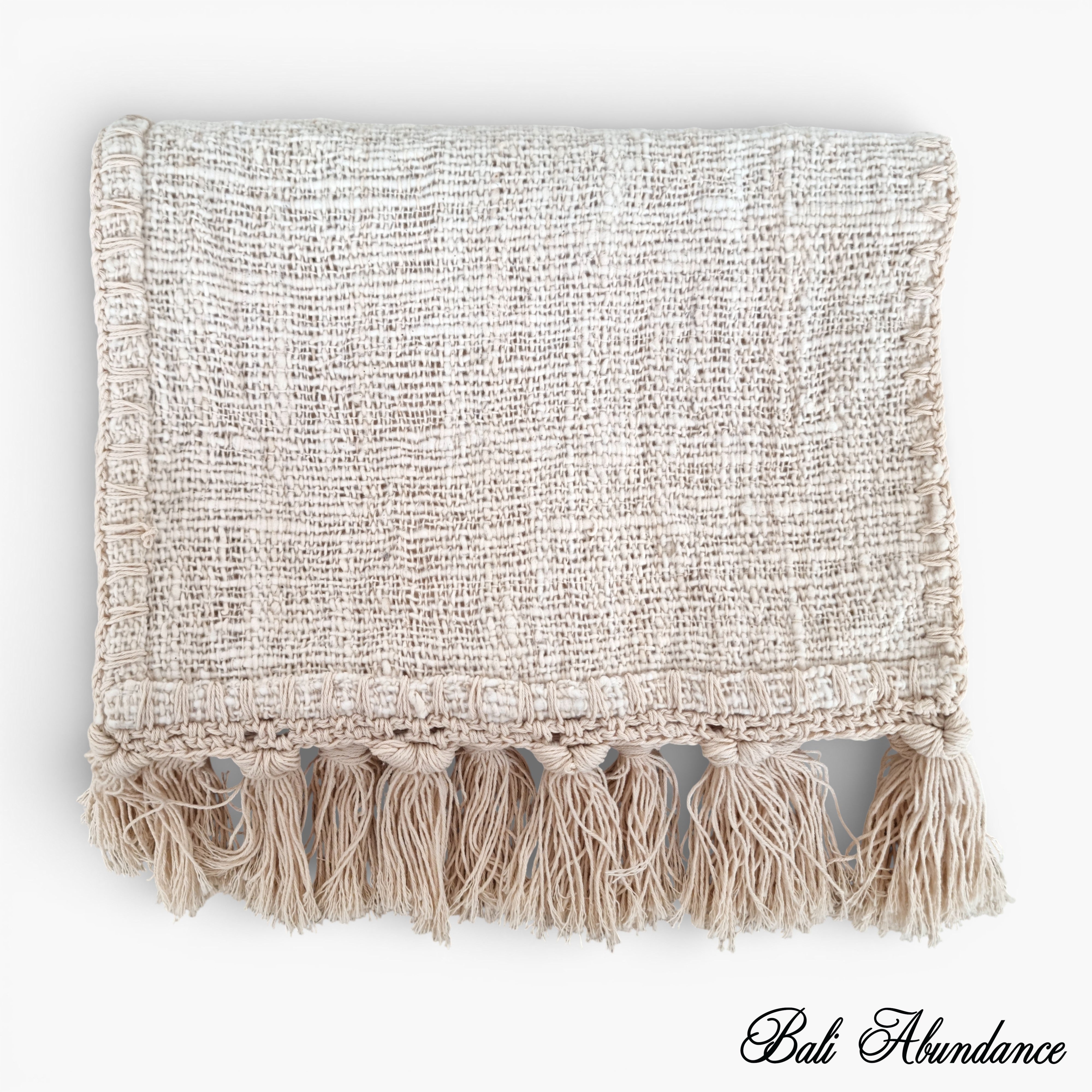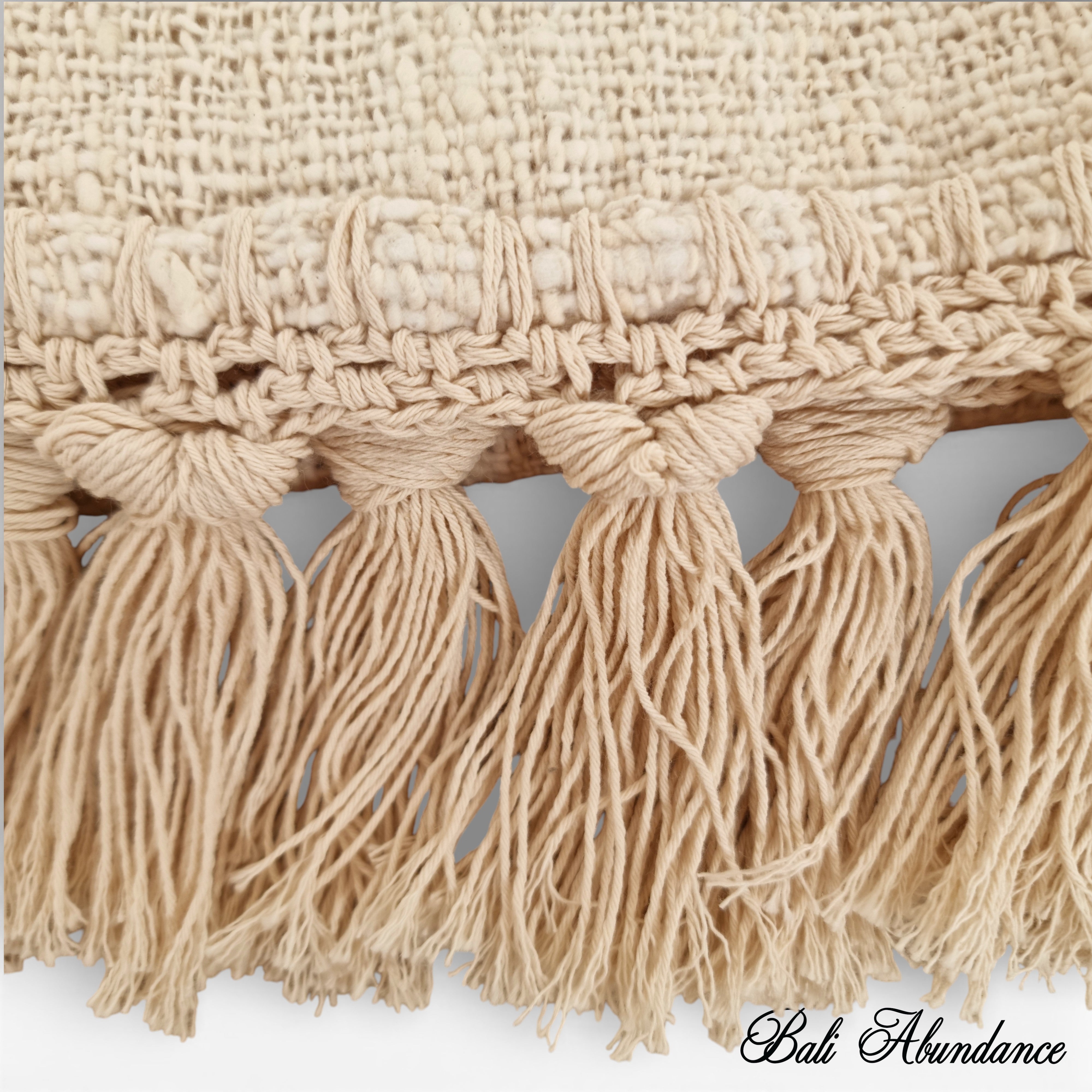 Artfully crafted from premium cotton, this table or bed runner brings authentic Balinese charm to your dining space or bedroom. Hand-woven using traditional techniques passed down through generations, each piece features decorative tassels and intricate macrame detailing that add movement, texture, and character to any setting. The natural fibres drape beautifully across tables, beds, or benches, creating visual interest whilst maintaining that effortless, globally-inspired aesthetic. Whether layered over a dining table for intimate gatherings or draped across your bed for a touch of bohemian elegance, this versatile runner transforms ordinary spaces into inviting sanctuaries. Perfect for those seeking to infuse their home with the relaxed, artisanal spirit of Bali.