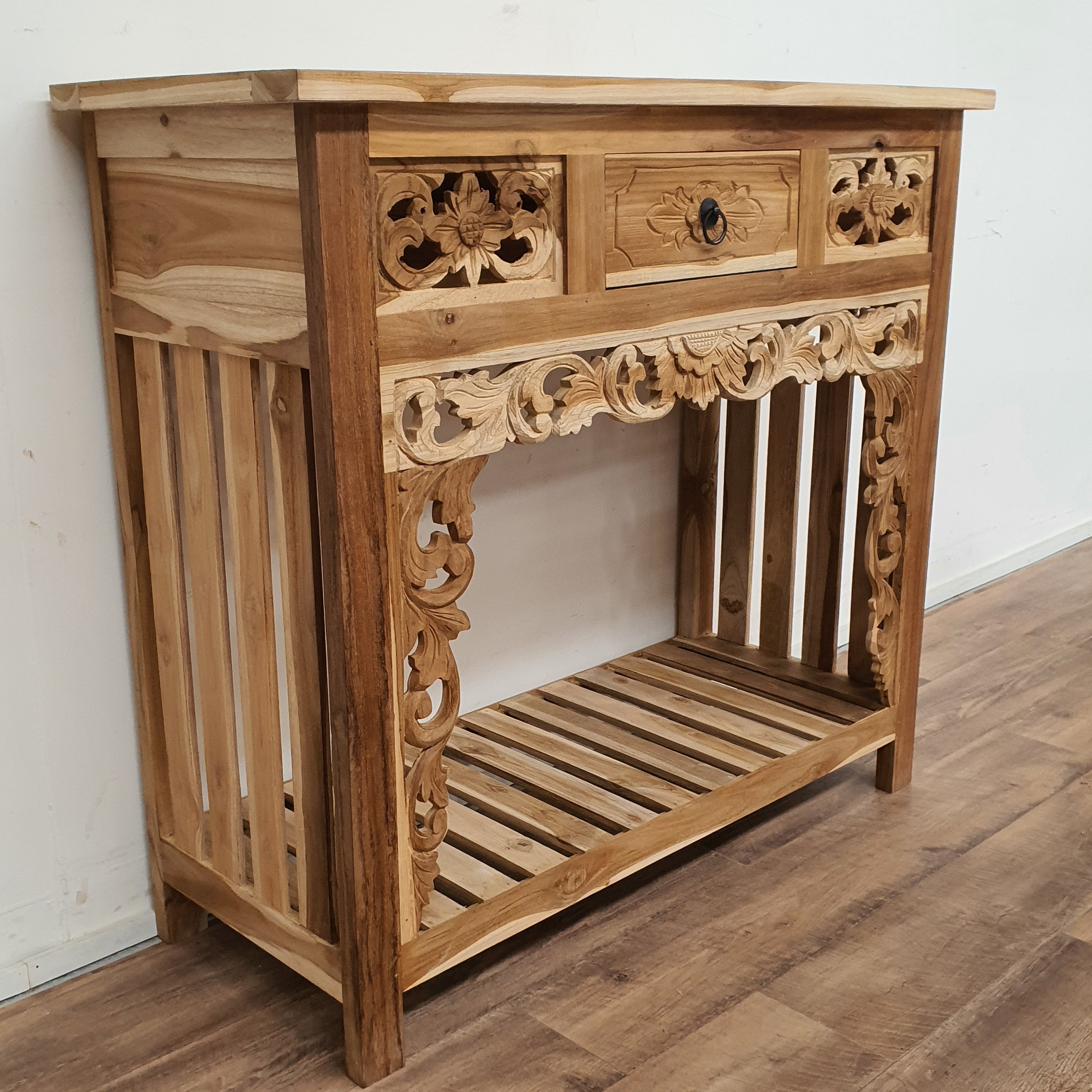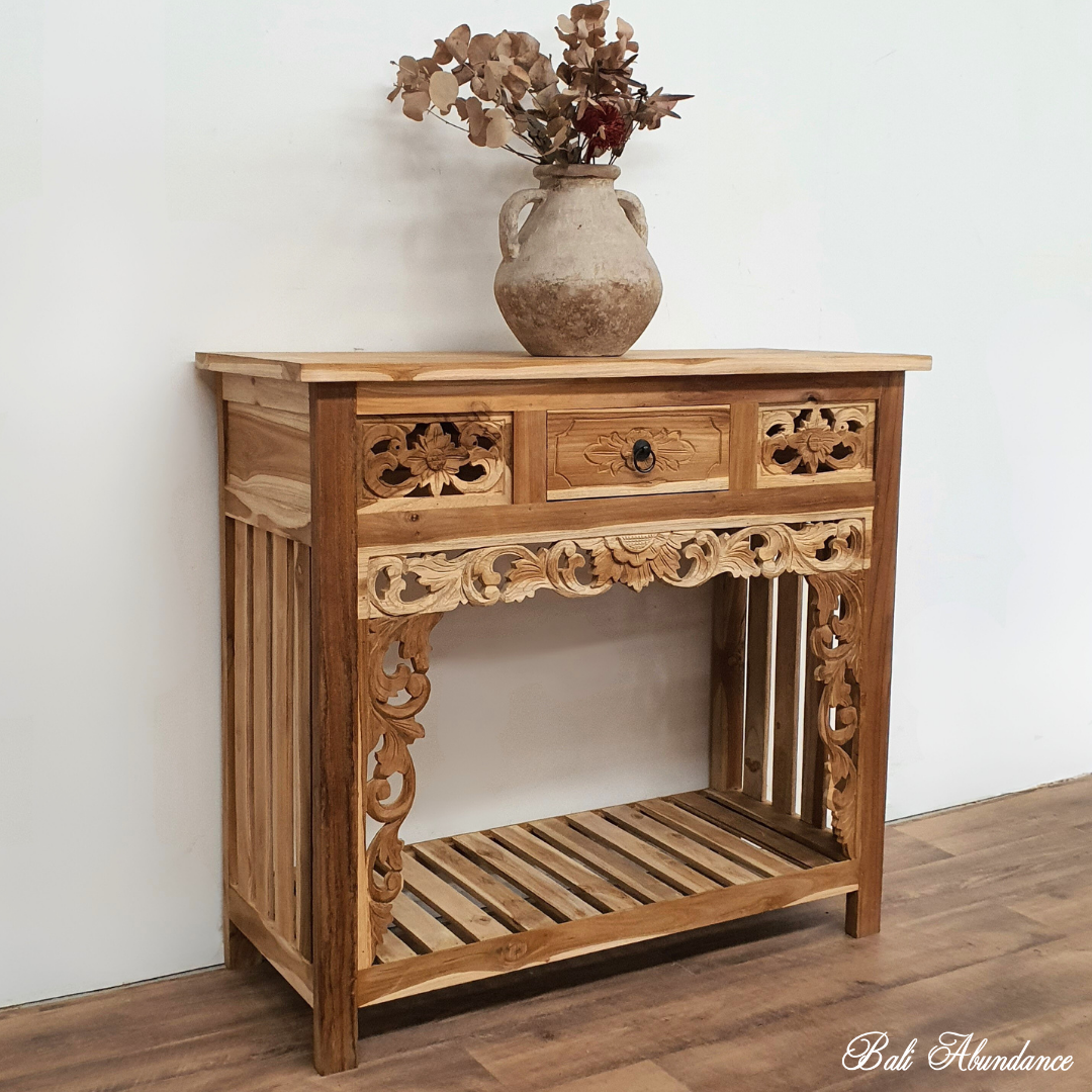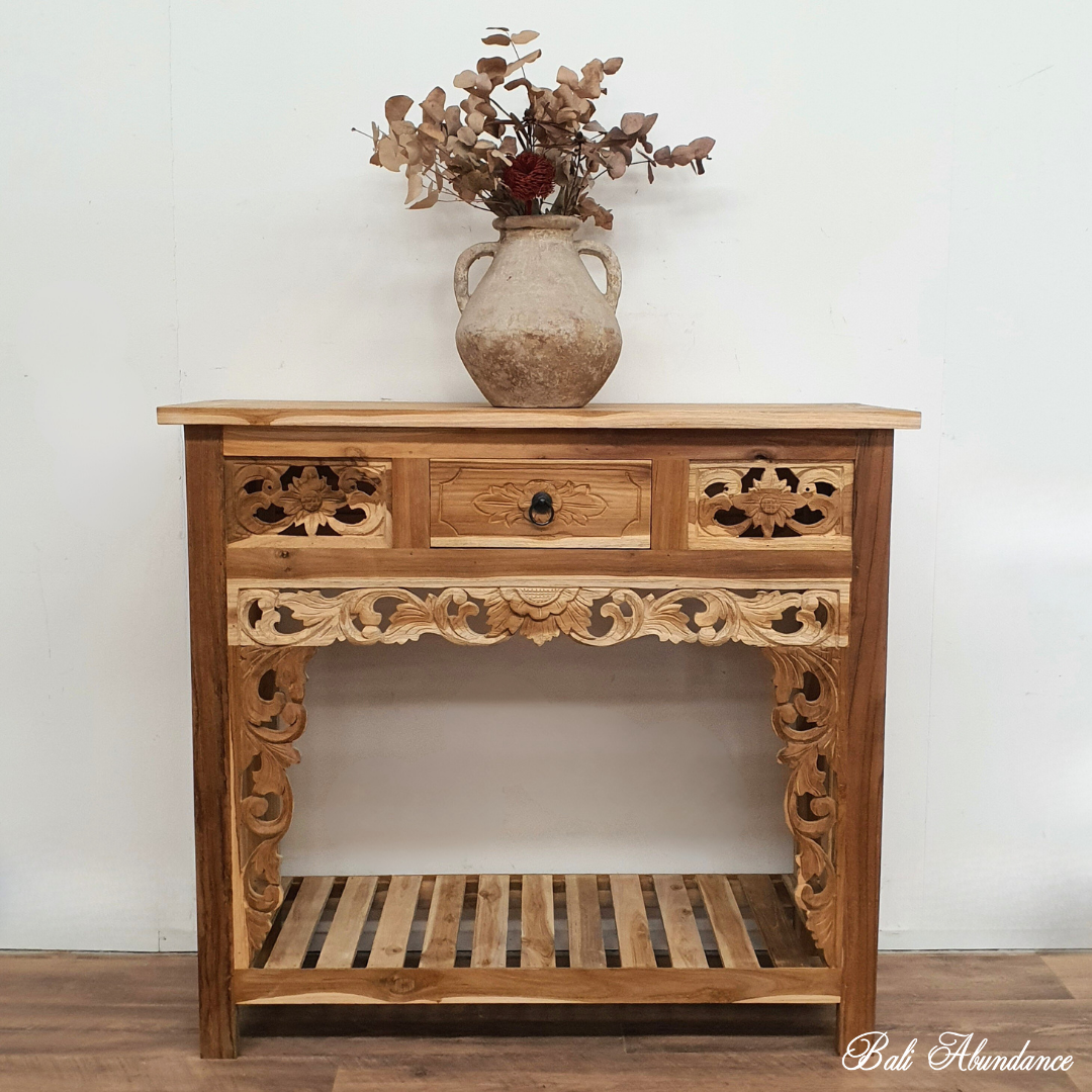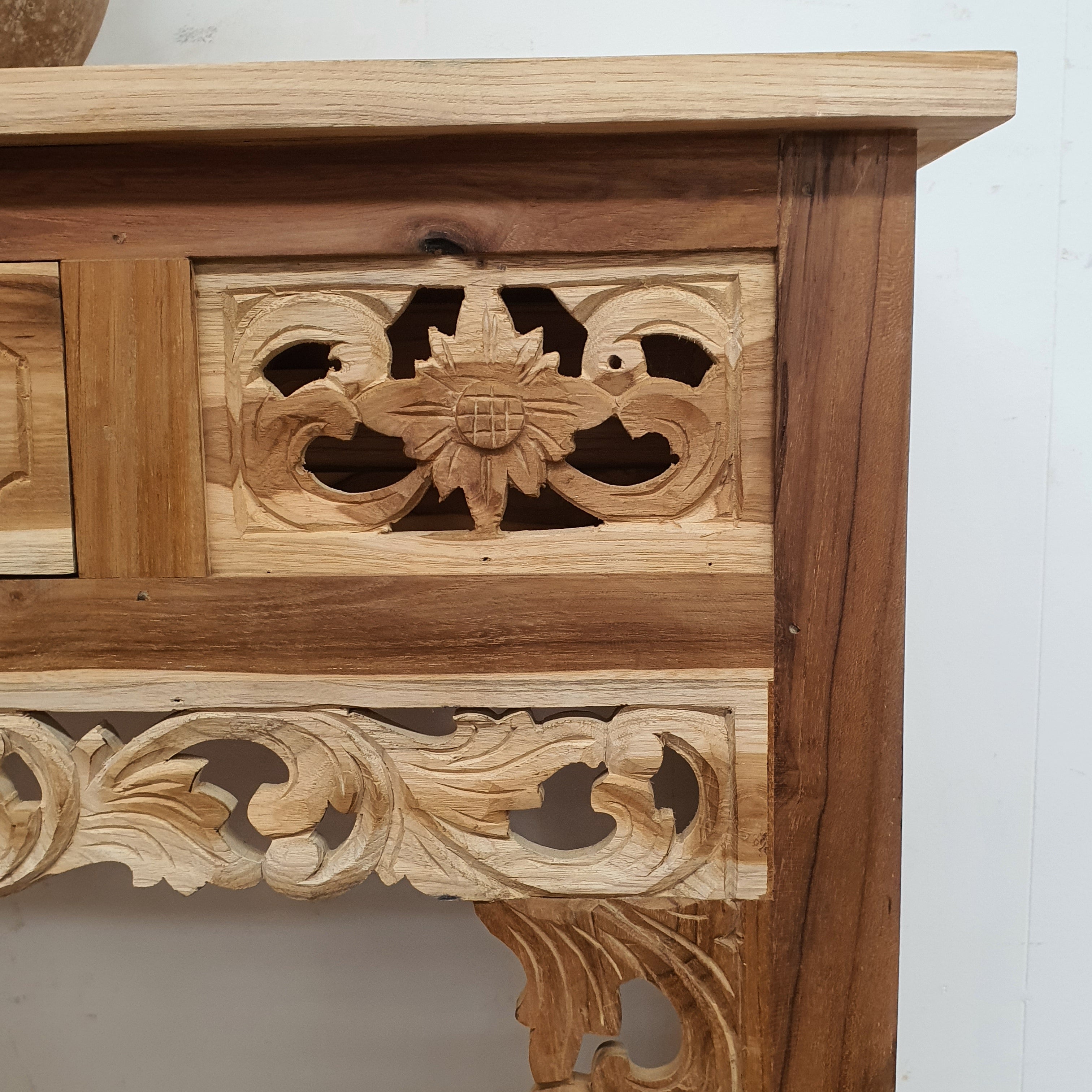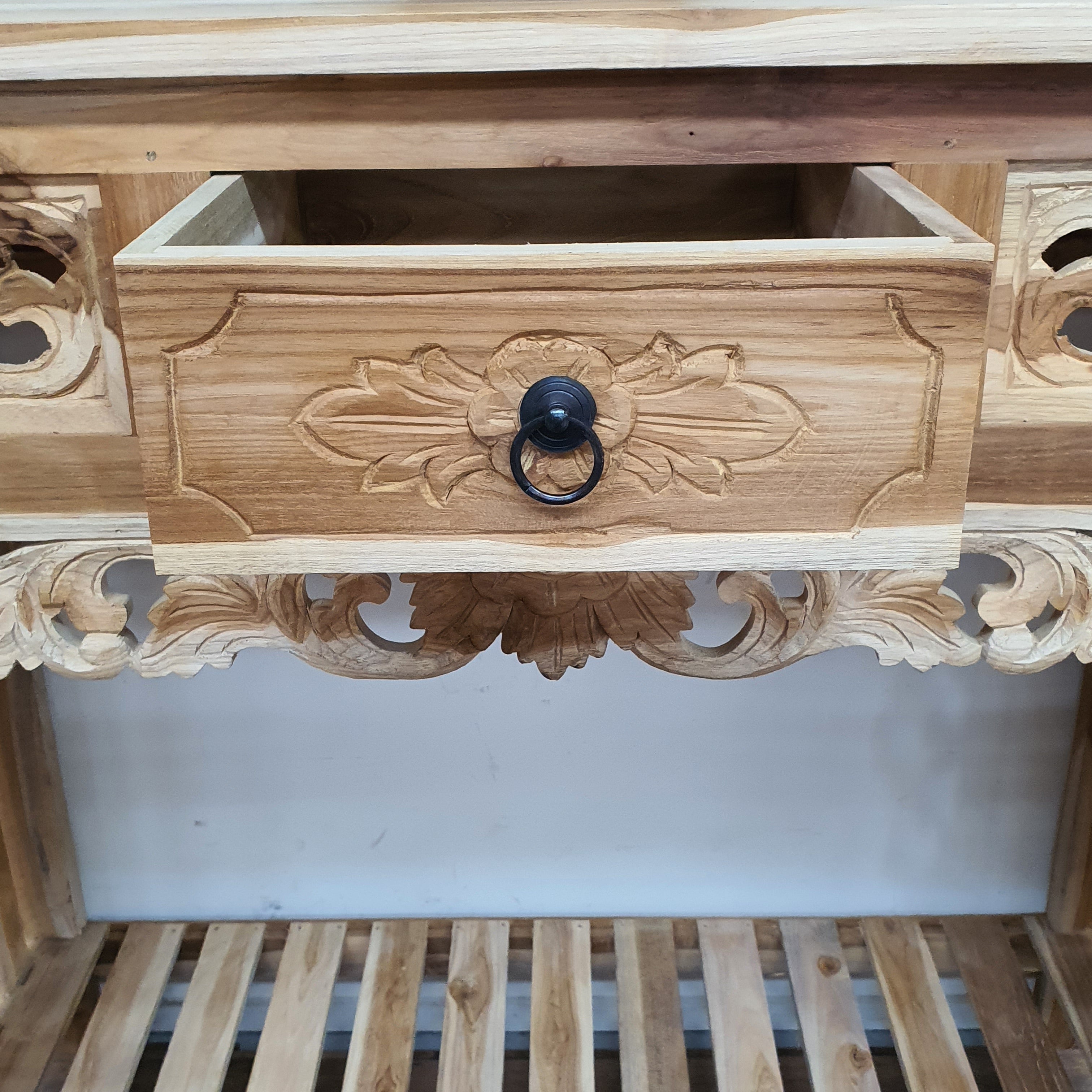 Introduce authentic Balinese soul into your home with the Jiwa Hand Carved Console, a striking testament to island craftsmanship and timeless design. Meticulously hand-carved from natural raw wood, this console table captures the essence of traditional Balinese artistry with its elaborate surface details and organic texture. Whether positioned in your entryway to greet visitors, styled as a bedroom accent piece, or repurposed as a distinctive home office desk, the Jiwa commands attention while maintaining an understated elegance. The thoughtfully integrated drawer provides hidden storage for personal items, keys, or workspace essentials, keeping your environment serene and uncluttered. The raw wood finish develops character and depth with age, creating a living piece that evolves alongside your home. Handcrafted by skilled artisans who honour centuries-old techniques, each console is uniquely individual. Invest in a functional artwork that brings warmth, cultural richness, and natural beauty to any room.
