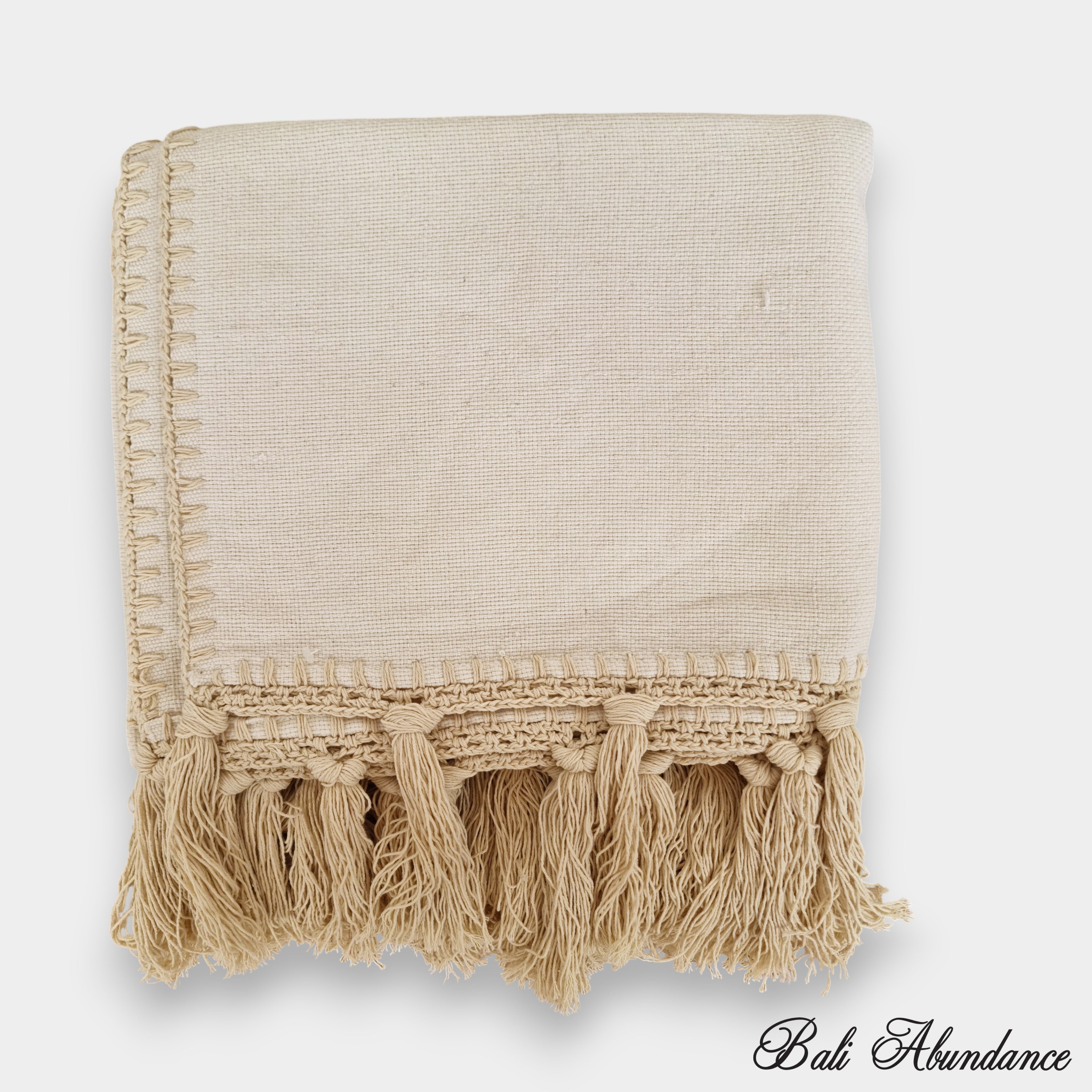 This hand made woven cotton macrame blanket is a truly unique piece crafted with care in Bali. Its cream colour adds an inviting vibe to any living space, perfectly blending with modern or traditional decor. The detailed macrame stitching along the borders highlights the exceptional craftsmanship, while the playful tassels add texture and charm. Ideal for cosying up on chilly evenings or enhancing your room’s aesthetic with an artisanal touch. Elevate your home with this exclusive handcrafted treasure that combines style, comfort, and cultural artistry.