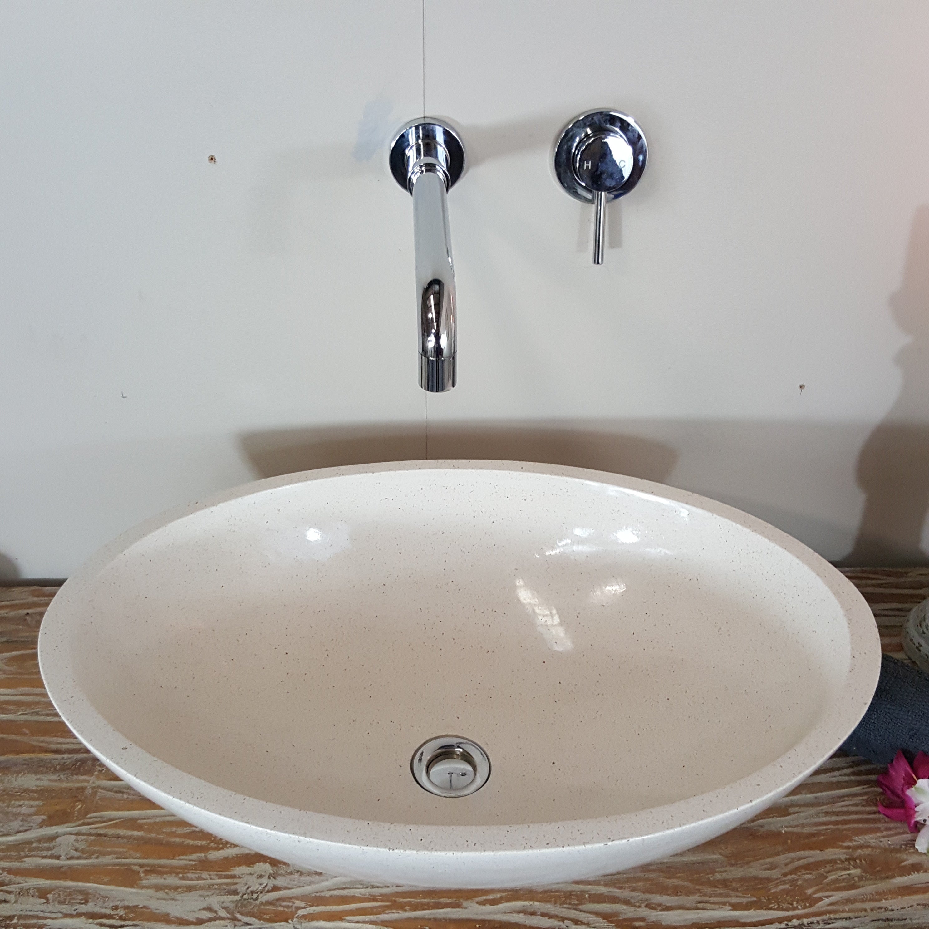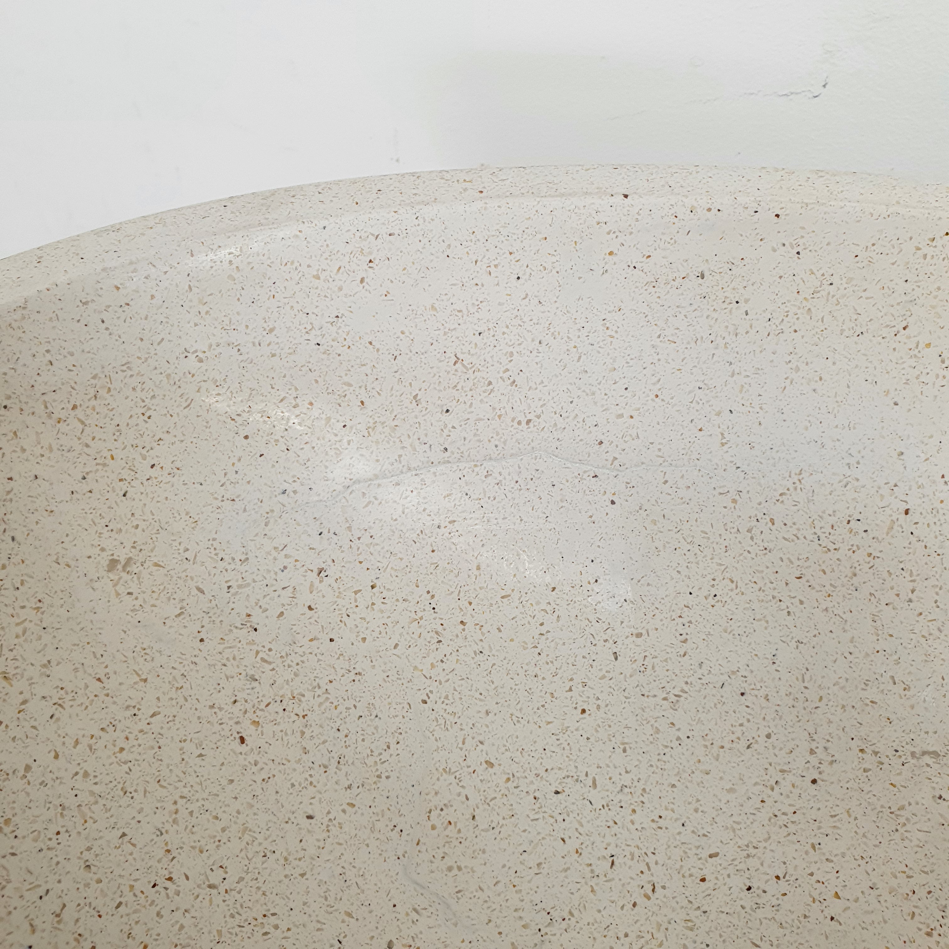 This basin has some imperfections see last two photos, just a hallmark of a hand made product. It is structurally sound just cosmetic and not so noticeable. Add some luxury to your bathroom with one of our Terrazzo basins. Each one hand made with Terrazzo resin composite.