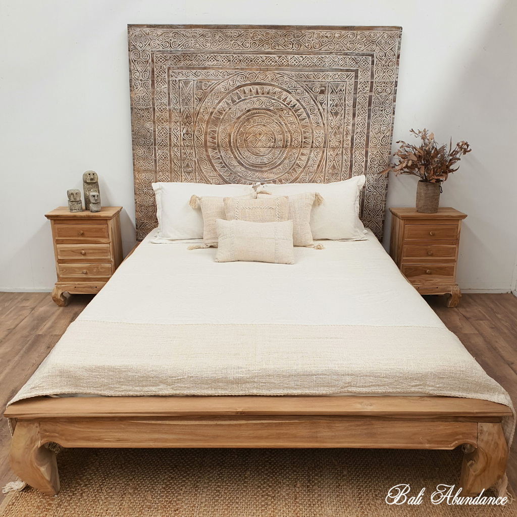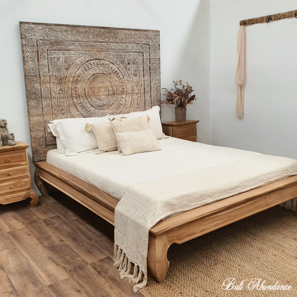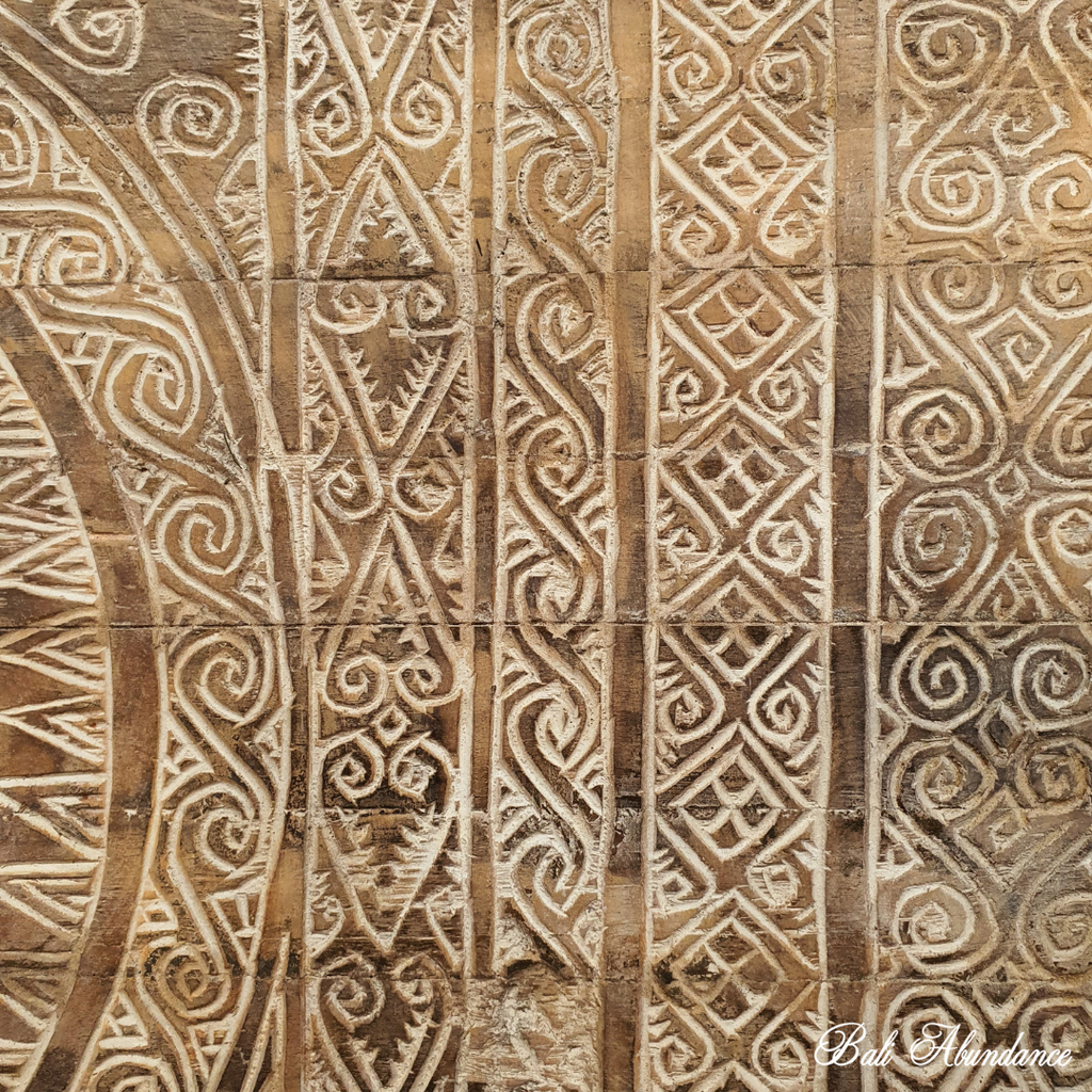This large Timor recycled teak wall panel is expertly hand carved to reveal intricate motifs that embody the rich cultural heritage of the Indonesian islands. Crafted from sustainably sourced teak, showcasing natural textures and patterns that enhance its authenticity and bohemian Bali appeal. Designed to transform your bedroom or living space, this stunning piece acts as both a striking focal point and a meaningful work of art, bringing warmth and character to your space. Its timeless design and island-inspired craftsmanship create an inviting atmosphere filled with the spirit of tropical Bali, making it perfect for those seeking unique and soulful décor.