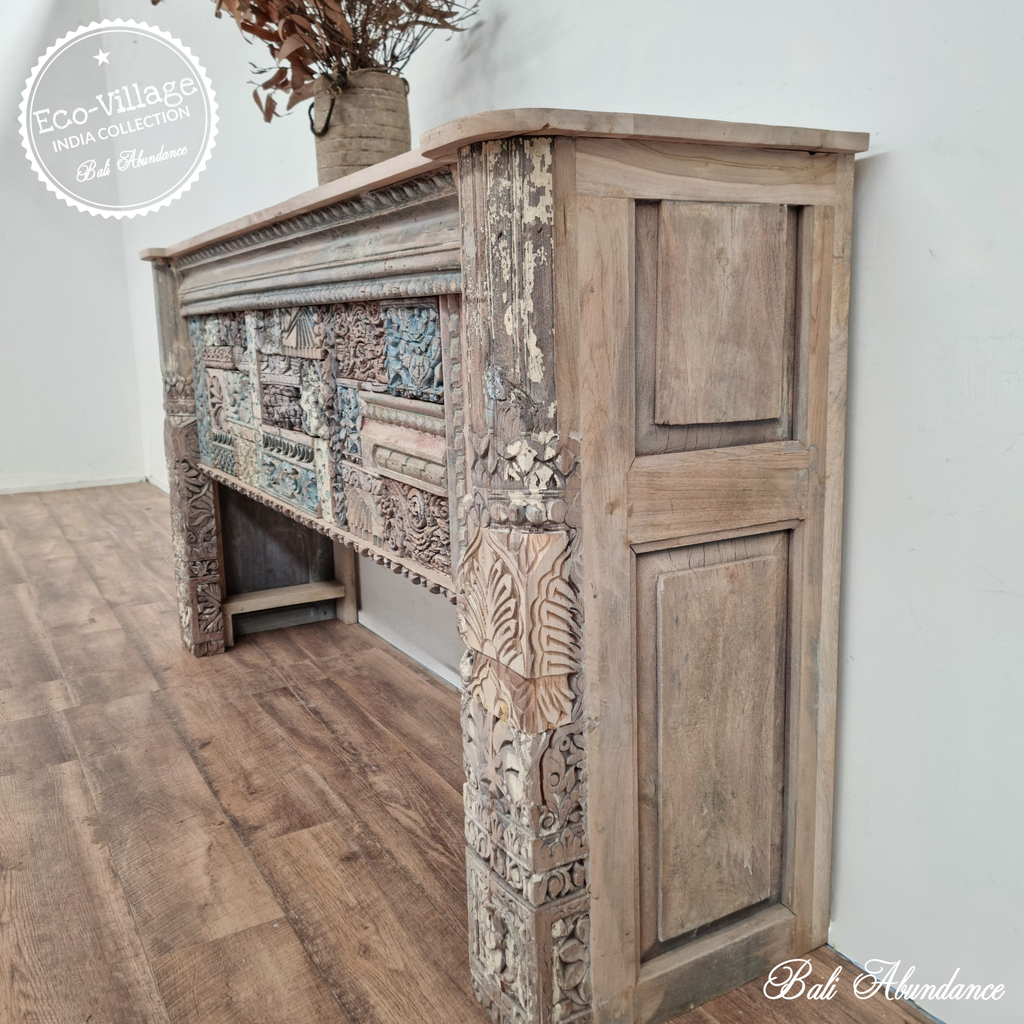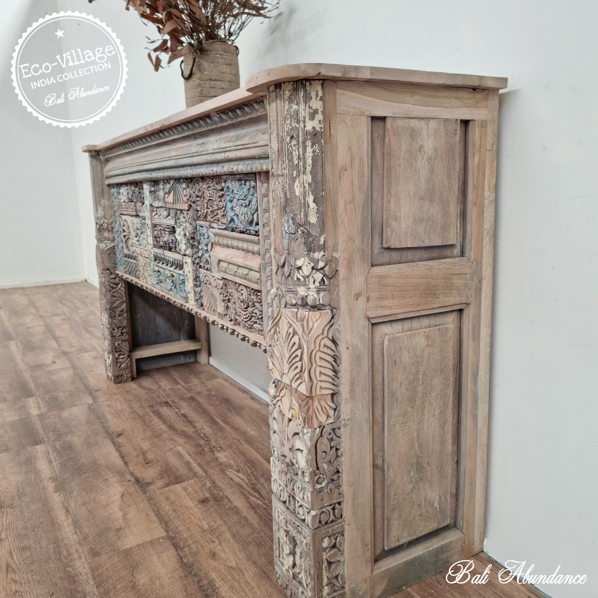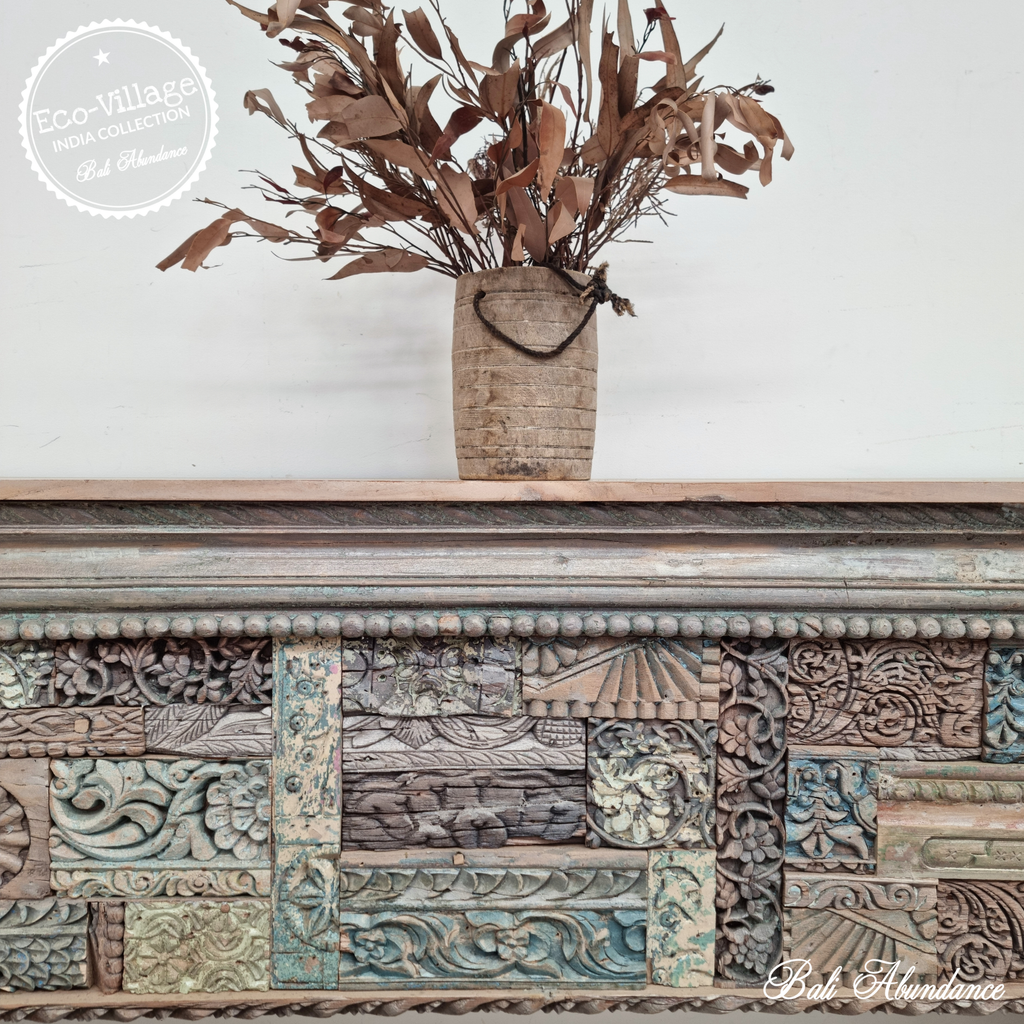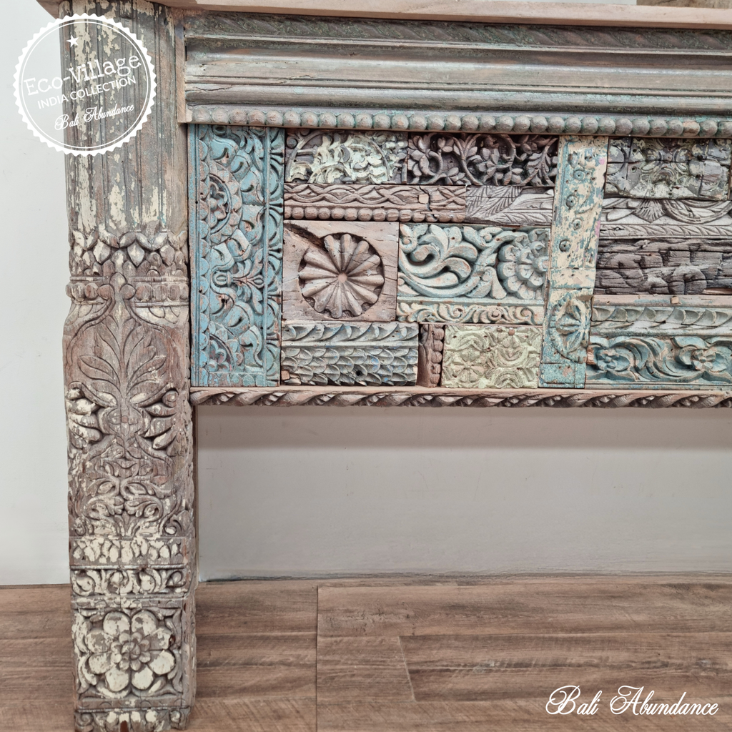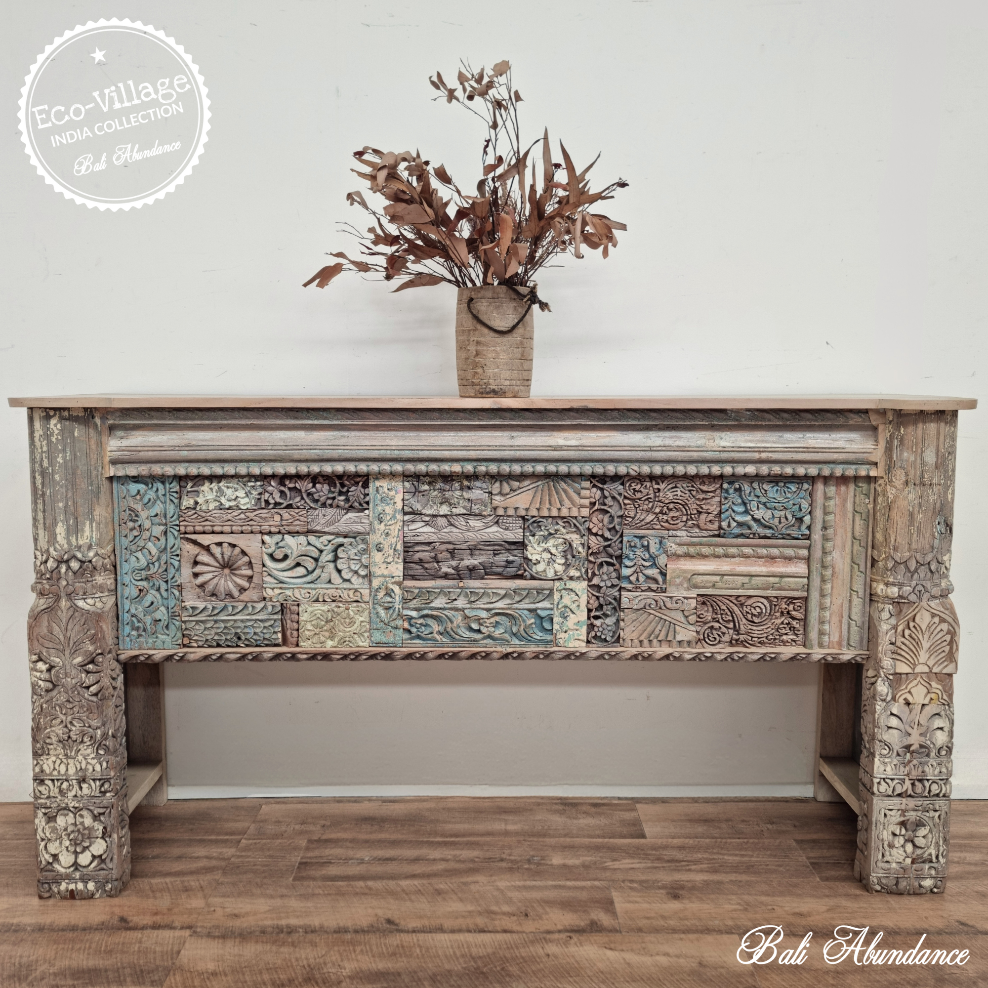 Handcrafted in India, this elegant console table boasts detailed vintage elements that make it a distinctive centerpiece. Featuring block print style carvings and rustic patina, this piece has been thoughtfully created using reclaimed vintage components. As part of the Eco Village Collection, it enhances your home’s character while supporting sustainable artisan work. Bring a blend of artistry, heritage, and eco-friendly principles into your living space with this stunning, unique piece.