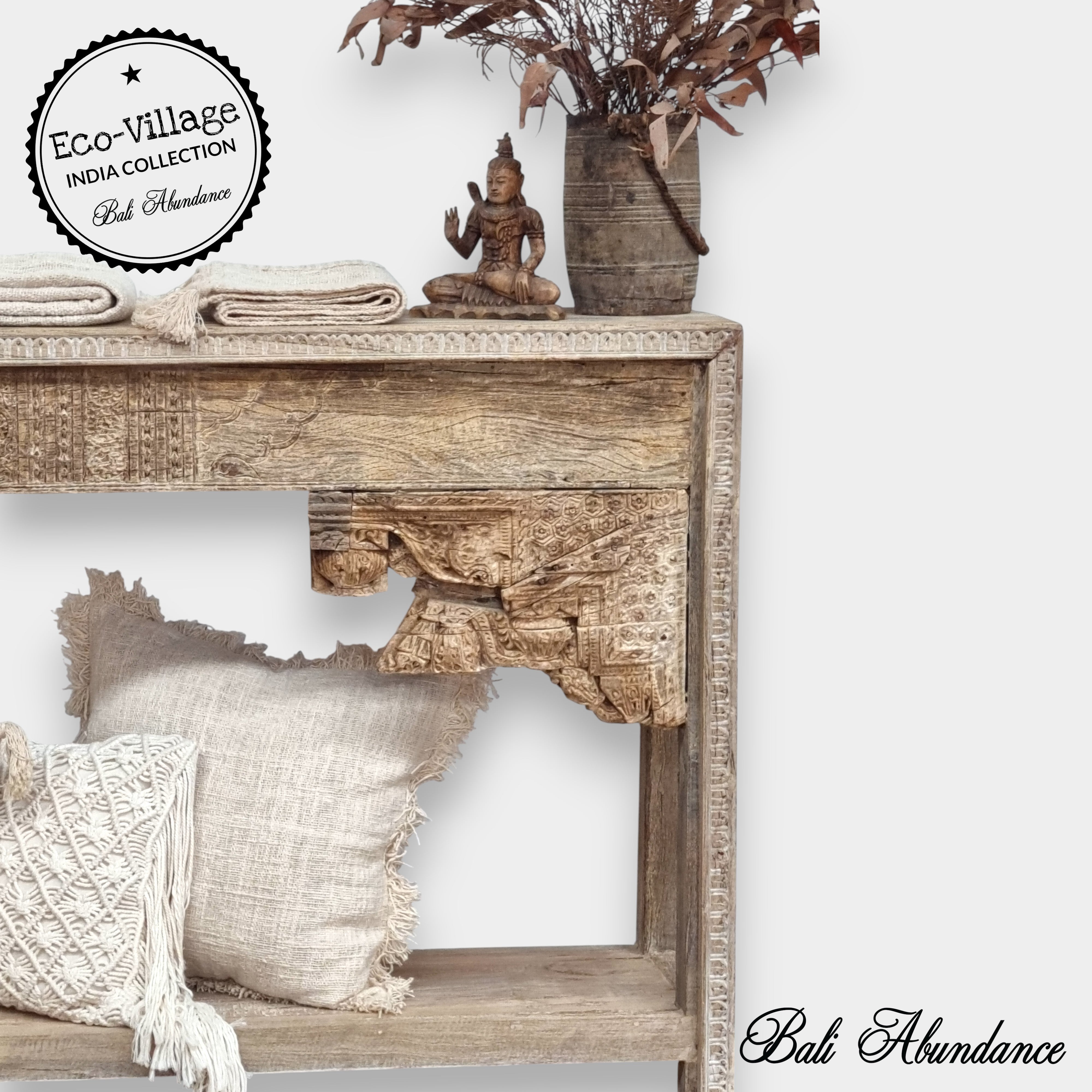 Handcrafted in India, this elegant console table boasts detailed vintage carvings that make it a distinctive centerpiece. Its enduring vintage finish brings sophistication to any room. As part of the Eco Village Collection, it enhances your home’s character while supporting sustainable artisan work. Bring a blend of artistry, heritage, and eco-friendly principles into your living space with this stunning, unique piece.