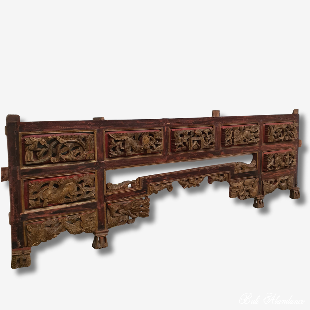 Add character to your home with this exceptional, hand-carved teak wall panel—a genuine vintage treasure from Bali. Each piece showcases intricate original Balinese craftsmanship, featuring detailed carved motifs that reflect the artistry of a bygone era. Carefully refurbished to preserve its authentic patina and heritage, this rare find brings warmth and cultural richness to any interior space. Perfect as a striking bedhead feature or statement wall installation, the natural teak wood develops a beautiful aged character over time. The organic grain patterns and hand-worked details tell the story of its origins, making it a conversation piece that connects your home to Balinese tradition. Whether you're curating a bohemian sanctuary or adding vintage sophistication to modern décor, this timeless panel infuses your space with genuine artisanal charm and enduring elegance.